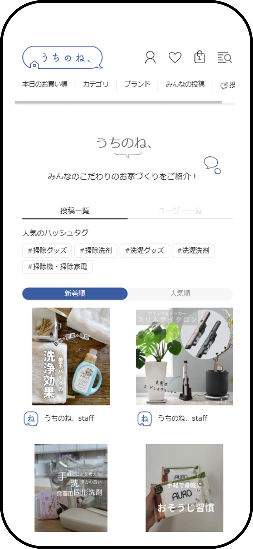 「うちのね、」はインフルエンサーや利用者に同社で販売する商品の中から、日用雑貨や家電、食品などの活用方法などを投稿してもらう形で商品の特徴などを紹介、当該商品の購入に誘導する。サイトは上からおすすめ商品やブランドの紹介、インフルエンサーやユーザーからの商品に関する投稿などを掲載。サイトのヘッダーには「本日のお買い得」「カテゴリ」「ブランド」「みんなの投稿」「投稿する」というリンクを設け、そこからそれぞれ販売中のおすすめ商品やホーム・インテリア、家電、グルメ・お酒など商品のカテゴリごと、ブランドごとに商品を一覧で表示したり、ユーザーの投稿を表示したり、ユーザーが自身が使用した商品や体験について評価や意見などを投稿できる。なお、投稿についての「いいね」や投稿者のフォローは会員登録を行うことで可能になるという。