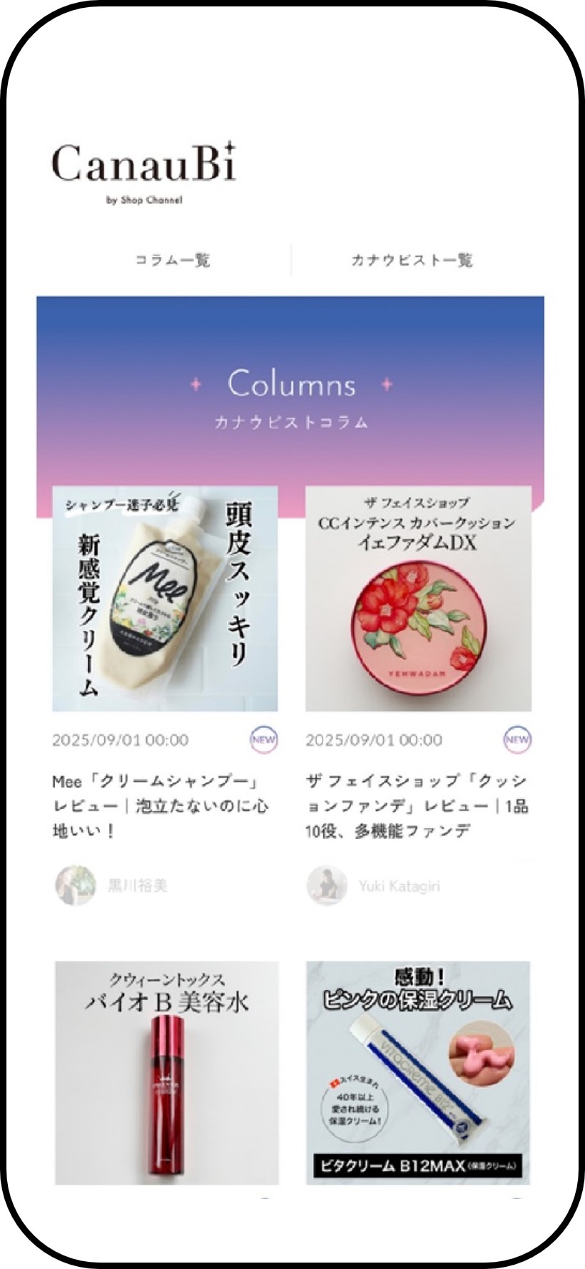 「CanauBi」はスキンケアやヘアケア、ベースメイク、メイクアップなどの化粧品やフレングランス、美容家電、美容グッズ、サプリメントなど美容・健康商品について美容家や専門医などがプロの視点から美肌を保つためのポイントなど関連する美容・健康に関する記事や動画などを投稿しつつ、関連商品を訴求、販売を促すメディア型サイト。サイトは上部に「カナウビスト」と呼ぶ美容の専門家によりコラムやおすすめ商品、メイクアップアーティストによるベースメイク法の解説といったページへのリンクを掲載。その下に「本日のお買い得商品」や「おすすめブランド」の一覧、カナウビストによるコラム、「みんなに投稿」として、ハッシュタグに「カナウビ」「canaubi」をつけてインスタグラムに投稿された記事をまとめたコンテンツを掲載している。