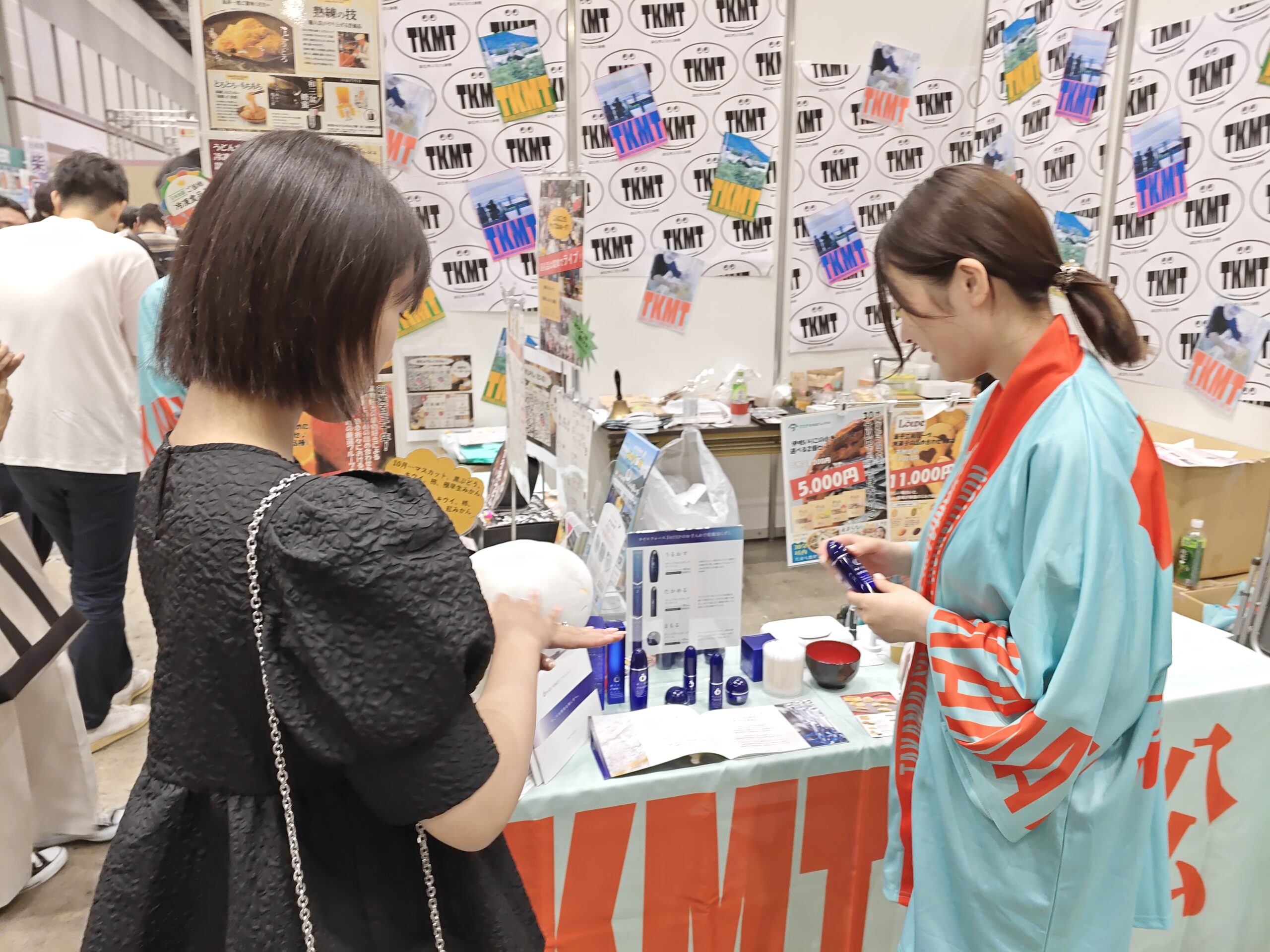 各自治体のブースは、創意工夫の様子が伺えた。山梨県富士吉田市のブースでは、VRでジェットコースターが楽しめる企画を用意。香川県高松市のブースでは、第一三共ヘルスケアの保湿系スキンケア「ライスフォース」を返礼品として紹介。人気の化粧水や美容液、クリームなどがタッチアップできる機会を設けた。