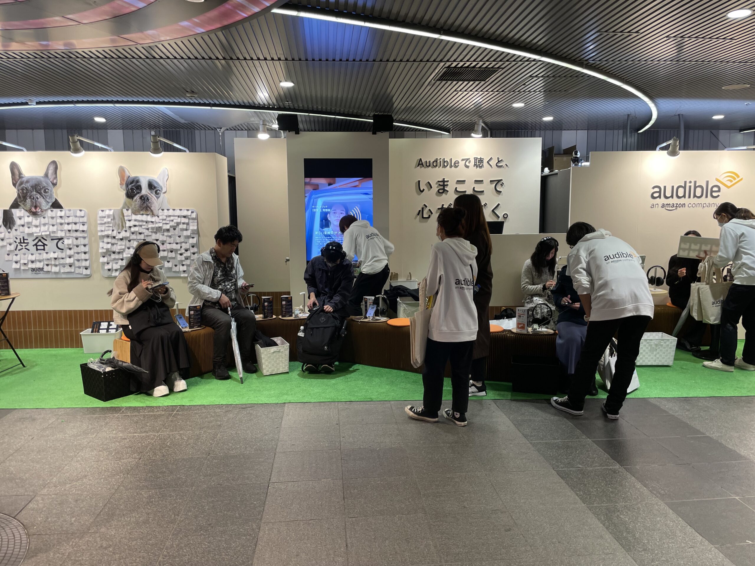 直近では11月7~9日の3日間、東京・渋谷の地下鉄に続く地下路の一角にタブレット端末とヘッドフォンを十数台ほど設置して行き交う人々に「オーディオブック」の試聴を促す「エキナカAudible体験」を実施した。